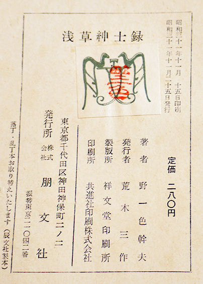浅草紳士録 野一色幹夫著 B6判カバ欠初版393p 朋文社 昭和31年