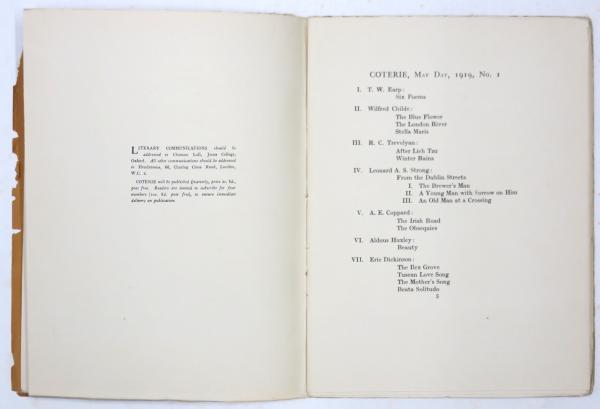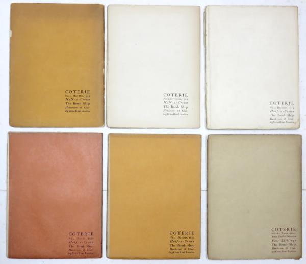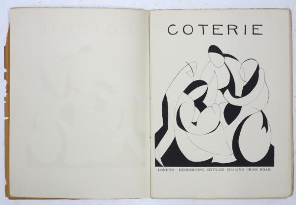 [Coterie] Contributors: Huxley,Conrad Aiken,Aldington,Herbert Read,J. G,Flether,Edith Sitwell,Blunden,Harold Monro,T. S. Eliot,Wilfred Owen,Amy Lowell,Frank Harris,Wilde et al.; Drawings: Walter Sickert,William Rothenstein,Nina Hamnett,Modigliani et al.