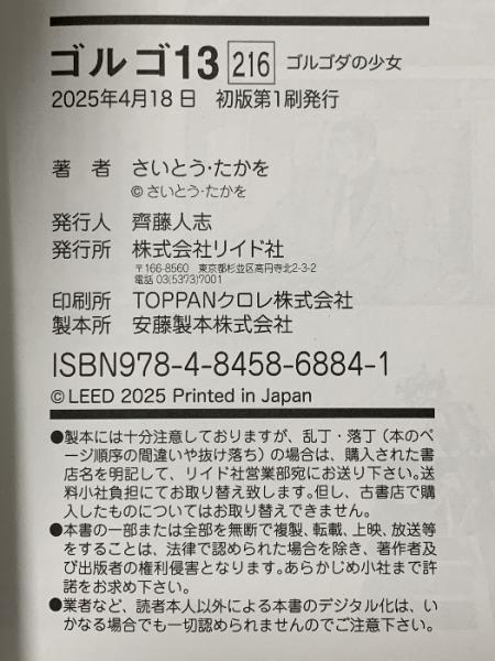 ゴルゴ13 ゴルゴダの少女 216 リイド社 さいとう・たかを