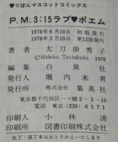 • 解説 太刀掛秀子傑作集1 P.M.3:15ラブ・ポエム 集英社りぼんマスコットコミックス 1978年3月12版 新書判.