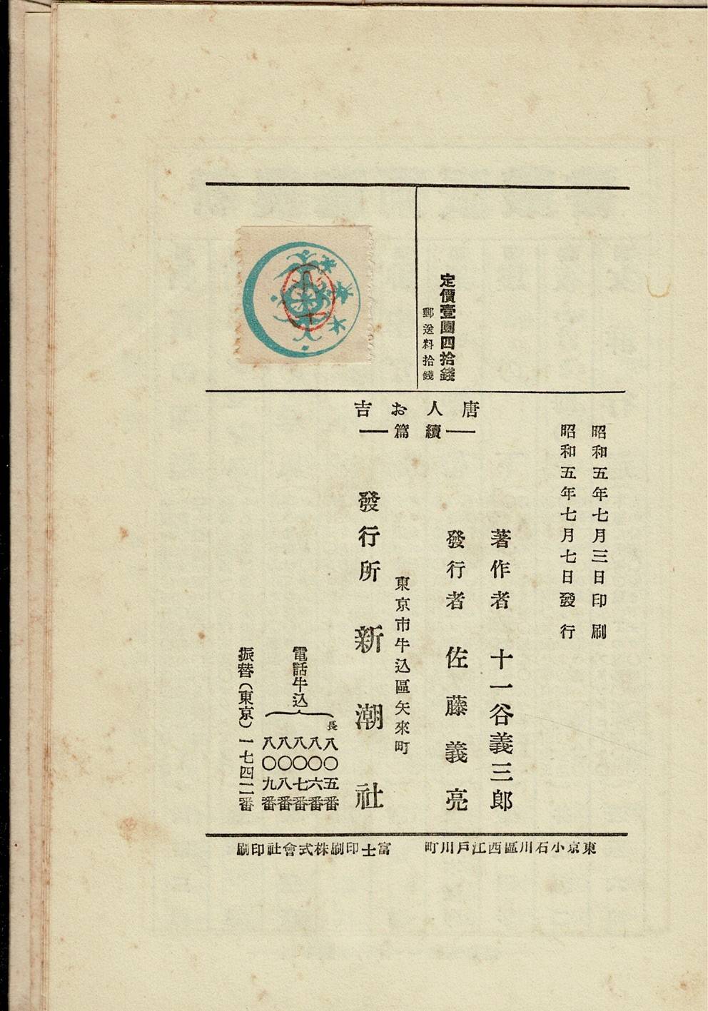• 解説 昭和4年発行。裸本。見返しに会社蔵書スタンプ・両見返しに個人蔵書印。裏表紙の小口・地の角に少つぶれ。