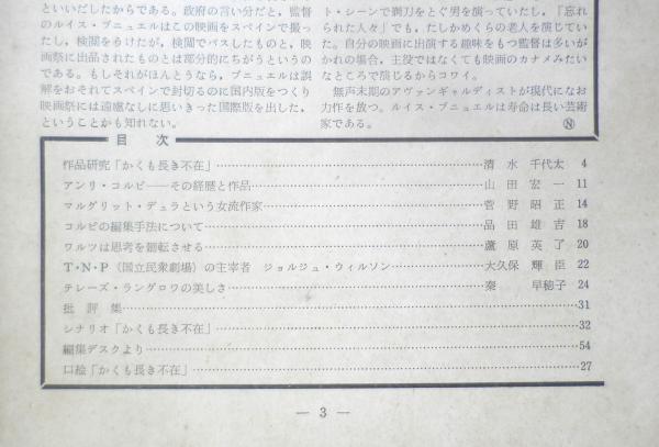 日本アート・シアター・ギルド 作品研究「かくも長き不在」/清水千代太 アンリ・コルピ・その経歴と作品/山田宏一 マルグリット・デュラという女流作家/菅野昭正 コルピの編集手法について/品田雄吉 ワルツは思考を廻天させる/蘆原英了 T・N・Pの主催者ジョルジュ・ウィルソン/大久保輝臣 テレーズ・ラングロワの美しさ/秦早穂子 他