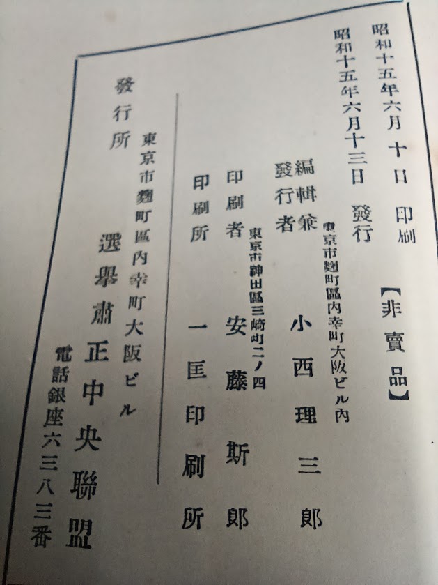 • 出版社 選挙粛正中央連盟(場所:東京市麹町区内幸町大阪ビル)
