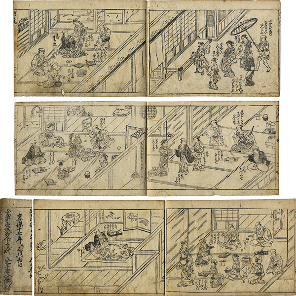 • 解説 一21枚3図・二21枚3図・三20枚3図・四22枚3図・五20枚3図 改装 12.7×18.6糎 拵帙入 巻首に其磧・自笑連名の序文 巻末刊記「享保十七年子三月吉日 ふ屋町通せいぐはんじ下ル町 八文字屋八左衛門板」、二冊目から五冊目は、版心「二」から始まっているが、『珍書刊行會叢書 第一冊(大正四年刊)』収録「傾城歌三味線」と比するに、目録・本文共にすべてあるため落丁ではないと推定する。越前国新保の分限者玉屋の伜新兵衛と三国の遊女小女郎との情話を、京島原・江戸吉原・大坂新町の三都の遊里を舞台にして展開した八文字屋本。