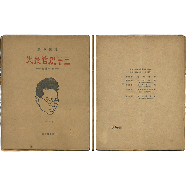 • 解説 初版限定版(記番110) ペン署名入 自費による第1詩集 仮綴装 全20頁 本冊少折レ跡有 外装なし完本 拵帙入 仮綴ホチキス部に欠損も見られず見事な保存と云える