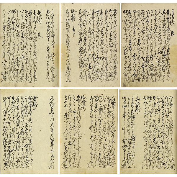 • 解説 一頁12行書 55枚 内題「理歌抄 上墨付五拾五丁」 改装 24.5×18.6糎 古木箱入 箱表「理歌抄」箱裏 全巻の内、春から秋までのほとんどを収録。収録歌次の通り、月清抄 春70首・拾玉抄 春51首・長秋抄 春41首・山家抄 春40首・拾遺抄 春122首・壬二抄 春99首/月清抄 夏23首・拾玉抄 夏55首・長秋抄 夏21首・山家抄 夏9首・拾遺抄 夏50首・壬二抄 夏36首/月清抄 秋141首・拾玉抄 秋130首・長秋抄 秋48首・山家抄 秋42首・拾遺抄 秋168首・壬二抄 秋104首。「今川氏真法名宗関 袋本墨付五十五丁 右無疑者也 丙午夏 即色菴則信[落款]」 月清抄・拾玉抄・長秋抄・山家抄・拾遺抄・壬二抄より、春・夏・秋の順に歌を収録。下巻に当たる、冬・恋・雑は欠く。