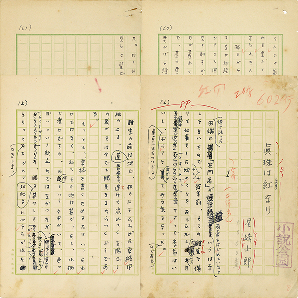 • 解説 『真珠は紅なり』 ペン200字詰完 「小説公園」印有 拵帙入 「焼け残った田端の「笑門亭」が商売をはじめているというはなしをきいたので、ふと十余年前、そこの離室を借りて仕事をした頃のことをおもひだした。~」