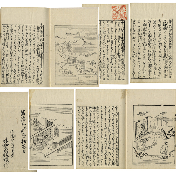 • 解説 絵34図 林和泉掾板 版本としては寛永頃の古活字版(八冊)に次ぐ整版本 原表紙 原題簽(巻一のみ部分) 22.5×15.6糎 少虫損・表紙少傷み有 補配頁8枚有 拵帙入 巻一50枚5図・巻二35枚5図・巻三36枚4図・巻四21枚1図・巻五21枚2図・巻六24枚2図・巻七23枚2図・巻八21枚2図・巻九26枚1図・巻十25枚1図・巻十一25枚2図・巻十二29枚1図・巻十三27枚2図・巻十四26枚2図・巻十五26枚2図表三刊記共 刊記「萬治二年巳亥初冬日 洛陽今出川書堂 林和泉掾板行」、補配頁(巻一の目一・五・七・十一・十六、巻二の三、巻五の二・二十)