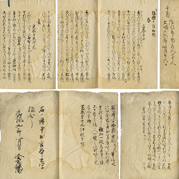 • 解説 一頁10行書 56枚 原表紙 23.4×16.6糎 拵帙入 水ムレシミ・傷み・虫損有 巻末元奥書「右一冊写冷泉亜相為廣筆結也 従田舎不邊到来依無所持早速馳筆了雖加一?烏焉之謡*有之後人一覧之次可了見者也于時 寛永第十九仲秋下句」/奥書「右一冊中書官本書写校合了 元禄九年八月日 金紫惟庸」 文明十六年七月十六日に足利義尚が催された千首歌会。春10首・夏7首・秋10首・冬8首・恋5首・雑10首を義尚・尊応・実淳・道秀・冬良・実隆・為広・基綱・公夏等の公家名流に、細川成之・宗伊らの武家、招月庵正般など20名が詠進したもの。