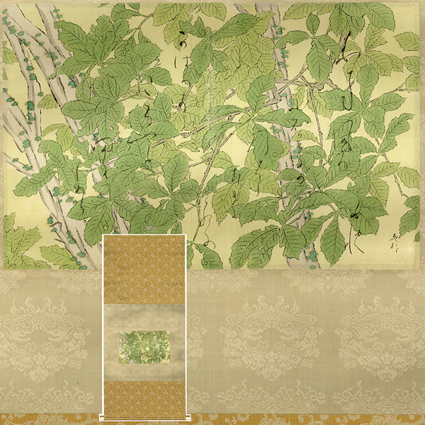 • 解説 『白南風の 光葉ののばら すぎにけり かはづのこゑも 田にしめりつつ 白秋』 白山春邦「きょろろ鶯」表紙画下絵(版に筆彩色・毛筆サイン入) 紙面20×31.3糎 幅面115×50.3糎 桐箱入 「白南風」(昭和9年 アルス刊)収録 <白南風=しらはえ、光葉=てりは> 「きょろろ鴬」表紙画と比するに微妙な違いが見られる。版をいくつか起こしたとも思えず、全て彩色の肉筆画とも考えられるが、判断がつきかねる。意訳「空が白み、南風が吹くこの頃、美しく照り輝く野バラも衰えてしまった。蛙たちの声も田園のここかしこに、湿って聞こえてくる。」