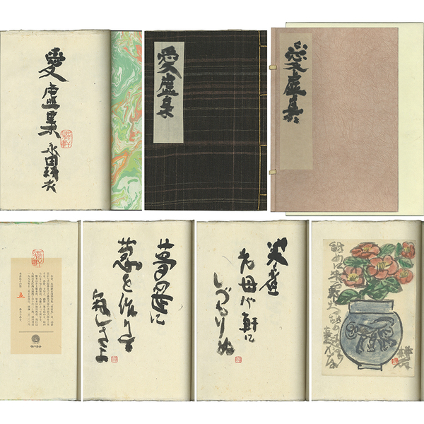 • 解説 特装22部 筆彩肉筆画賛1葉・毛筆句10首(各冊内容異なる) 見返しマーブル染 肉筆題簽付芭蕉布地表紙 和綴装 刊行案内・仕様紙片付 肉筆題簽付紙装四方帙・外函 頒価25万円 記番壱から弐拾番までと番外弐部の弐拾弐部を上木し、番外本は著者家蔵と姫路文学館蔵である。