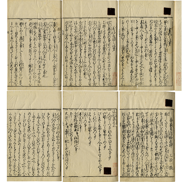 • 解説 各冊表題紙数 一「書札」83枚・二「請取渡 酌 通 元服 躾方」116枚・三「公武之沙汰 嫁娶 聞書秘傳 萬秘傳」126枚・四「三議一統」161枚・五「大双紙」138枚 改装紺表紙 26.8×17.6糎 西荘文庫旧蔵 拵帙入 《一》表題「大諸禮集一 書札」(巻一内題)書札之次第46枚/(巻二内題)書札之次第中12枚/(巻三内題)書札之次第下25枚/《二》表題「大諸禮集二 請取渡 酌 通 元服 躾方」(巻四内題)萬請取渡之次第28枚/(巻五内題)酌之次第27枚/(巻六内題)通之次第同喰様18枚/(巻七内題)元服之次第17枚/(巻八内題)萬躾方之次第26枚/《三》表題「大諸禮集三 公武之沙汰 嫁娶 聞書秘傳 萬秘傳」(巻九内題)公武之沙汰16枚/(巻十内題)嫁入次第9枚/(巻十一内題)膳部之次第19枚/《聞書秘伝》(巻十二内題)萬秘伝18枚/《四》表題「大諸禮集四  三議一統」(巻十三内題)當弓法躾之抄 三議一統79枚/(巻十四内題)當弓兵躾之抄下目録 82枚/《五》表題「大諸禮集 五終 大双紙」(巻十五内題)諸礼集之上52枚/(巻十六内題)諸礼集之中45枚/(巻十七内題)諸礼集之下41枚/、〈巻二だけ最終頁に終の表記なし「国会図書館蔵本」も同じ〉