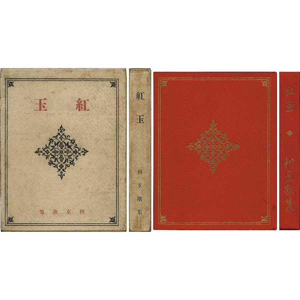 • 解説 特製本 装幀・児島喜久雄 赤布装 赤栞紐切レ一部残存 三方金 函少シミ 奥付「大8・7・20」発行 拵帙入 初版本は「大8・7・3」に対し、特製本は「大8・7・20」に発行。限定部数は20部とも言われているが定かではない。表紙の布や見返しをより鮮やかに、表紙の模様及び表題を金押しに、また本文用紙の違いのみならず三方に金を施すなど、まさに特製本と云うに相応しい出来栄え。前付と目次の間に「武者小路実篤兄へ」「大正八年五月東京玄文社発行」の2葉を付す。本冊・函の状態も含め満足のいく逸品。