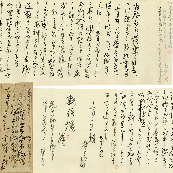 • 解説 斎藤親信宛 明治27年11月20日 毛筆65行 筆名・高山林次郎(本名) 封筒付 宛先人は樗牛の実父 「~ 月々御送の金今月分は新の町には廻被下候由難有奉存候但若し少々仔細にては今後は例の如く月の半は頃少々御送被下候様願上度候良太衰弱の模様さぞかしと思遣実に痛心の事に御坐候 ~」