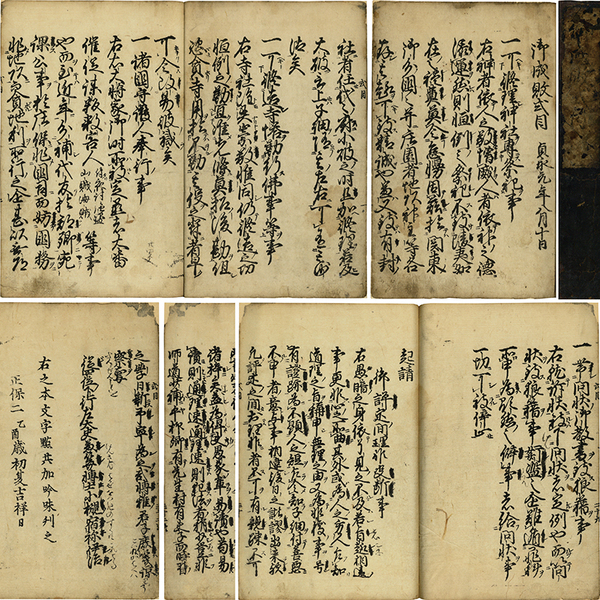 • 解説 一頁7行書 32枚 内題「御成敗式目 貞永元年八月十日」 刊記「右之本文字點共加吟味刊之 正保二乙酉歳初夏吉祥日」 原表紙 28.3×18.3糎 拵帙入