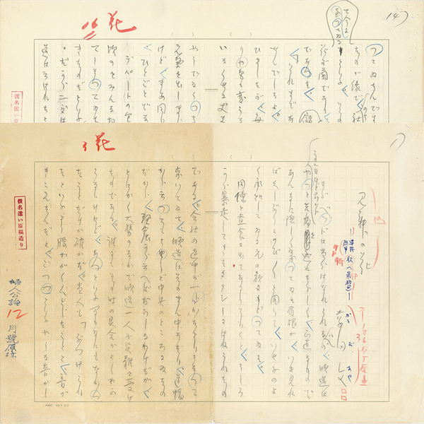 • 解説 『見舞の花-連載随筆・駅(最終回)-』 鉛筆400字詰完 欄外に「婦人公論12月号號原稿」 1・2枚目ヤケ有 「まだベッドは当分はなれられないが、順造はこの二日ほど前からやっと苦痛を逃れたらしく、~」