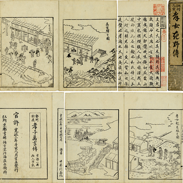• 解説 12枚見開き2図入「高宮驛之図」「孝女赴彦根之図」 京都書肆循古堂淡海荘兵衞梓 原表紙 原題簽「江州高宮/孝女起野傳」 22.6×15.7糎 巻末刊記「官許 寛政三年辛亥八月吉旦發行/弘所 京都書肆循古堂淡海荘兵衞梓」関場忠武蔵書印三種「東西書屋関場氏所蔵之印」「畊雨珍蔵」「忠孝吾家之宝関場氏所蔵経氏吾家之田」・秋山不羈斎蔵書印「不羈斎図書記」