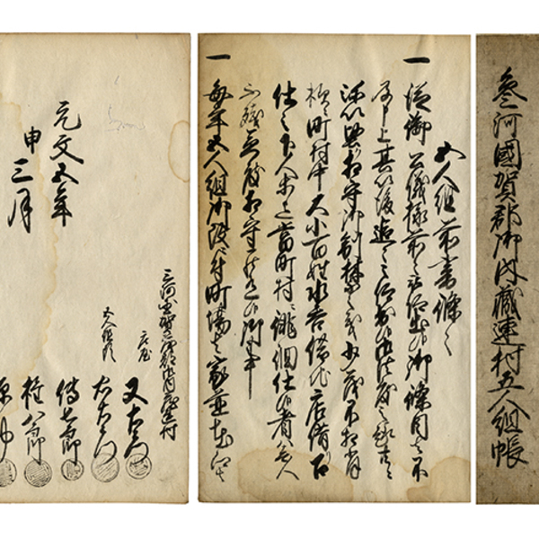 • 解説 一頁8行書 49枚 内題「五人組前書條々」 原表紙 表題「元文五年 参河國賀(茂)郡御内蔵連村五人組帳 申三月」 27.8×18.7糎 拵帙入