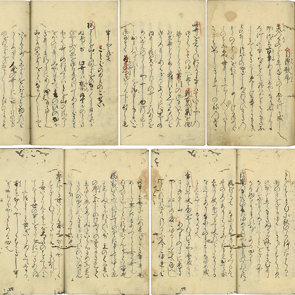 • 解説 一頁9行書 95枚 170首収録 原表紙 書題簽「自讃歌*全」 20.8×14糎 虫損有 巻頭「自讃歌序 天の下のどかにてなみのこゑしづかなりし御代は百年あまりに~」