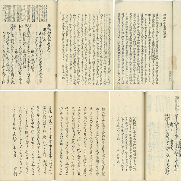 • 解説 一41枚・二43枚・三56枚・四60枚広告共 原表紙 原題簽「後撰和歌集標注 二(~四)」(一欠) 27.4×19.2糎 拵帙入 二冊目シミ有 一41枚(提要9枚・巻一~巻五32枚)/二43枚(巻六~巻十)/三56枚(巻十一~巻十五)/四60枚(巻十六~巻二十42枚・序三種6枚・跋文1枚・奥書2枚・萬笈堂広告9枚)