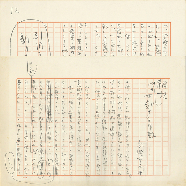 • 解説 「解説『女剣士』の屋敷」 鉛筆400字詰完 「≪僕はあくまで気性にたよるほかありません。そして知性か、虚無を割り切った後に尚、文学の形に於て何物か建設しうるかどうか、もはや文学をすてて行動に走る以外に道がないか、僕のとる道はその結果へおしすすむほかに仕方がなくなりました。≫(矢田津世子宛書簡昭和十一年六月十七日消印) 私に、坂口安吾と ~」