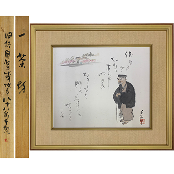 • 解説 『誰それとくれてかすむや門の原 かるたほと門のなの花咲きにけり 一茶 (一茶像) 千甕[落款]』 紙面42×49糎 額面63×69.5糎 幅仕立て時の共箱蓋付…箱蓋表「一茶坊」/裏「旧作自鑒感慨多 八十八翁千甕[落款]」 文政後期の一茶の句 (鑒=鑑)