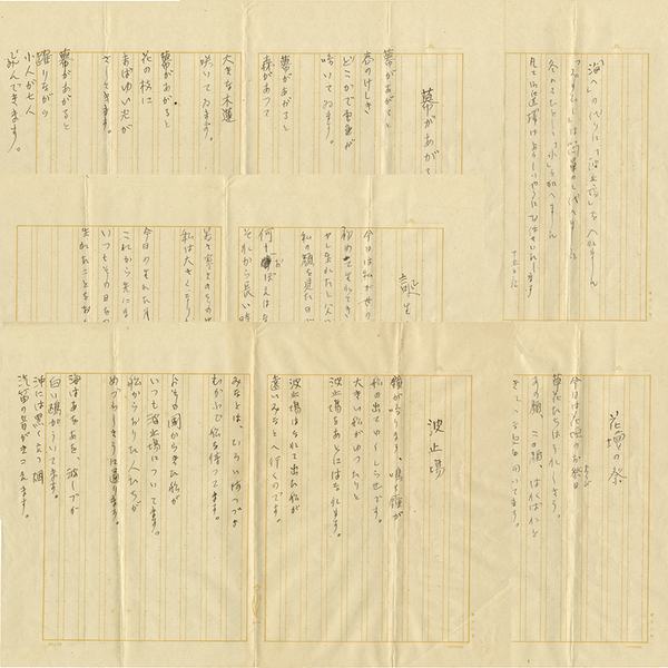 • 解説 『波止場』『花壇の祭』『誕生日』『幕があがる』 ペン400字詰各1枚完 無署名 差し替えの伝文1枚付 毛筆署名入送付封筒付(清原齊宛 昭和15年2月16日 朱筆で「速達 原稿在中」とあり) 差し替えの伝文「「海へ」の代りに「波止場」を入れました「みのむし」は簡単のと代へました 冬のうたとして「氷」を加へました 凡て御選擇はよろしいやうにお任せいたします 十五日記」