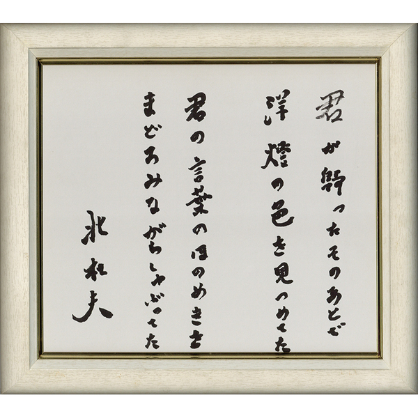 • 解説 『君が歸ったそのあとで洋燈の色を見つめてた 君の言葉のほのめきをまどろみながらしゃぶってた 北杜夫』 毛筆 額面29×32糎(外箱なし)