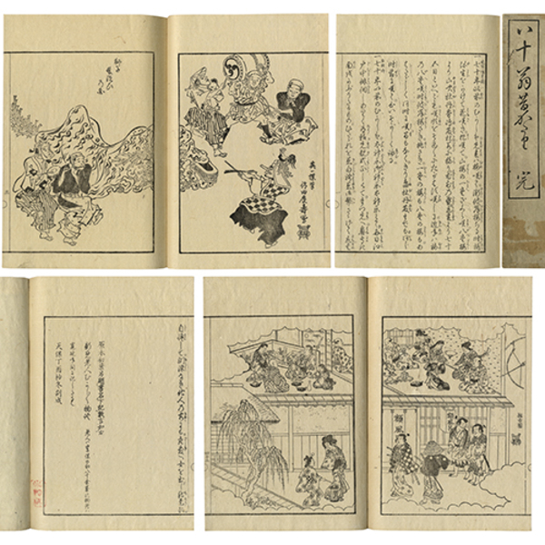 • 解説 享保十七年成 48枚(表二表題・東岳序・自序・本文) 見開き7図 尚友堂蔵版 原表紙 原題簽「八十翁昔かたり 完」 25.8×18.1糎 元袋付 拵帙入 元袋・表二表題「八十翁疇昔話 尚友堂蔵」 東岳序「天保戊戌季秋 東岳司直并書」、本文末「原本初葉別題書名下記数言如左/新見老人むかし/\物語 老人ハ享保の初八十余歳此物語ハ/寛延年間に記したる也/天保丁酉抄冬刻成」