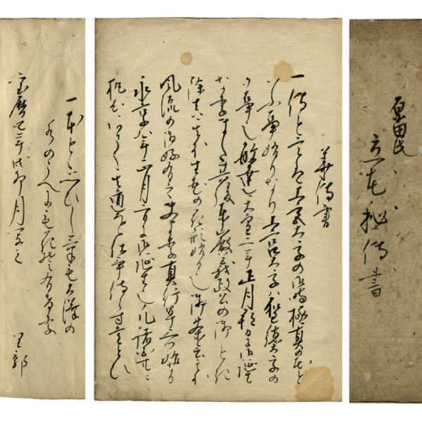 • 解説 一頁9行書 28枚表三共 内題「華傳書」 巻末「宝暦四年戊卯月写之 里部」 原表紙 表題「原田氏 立花秘伝書」 28.1×21.5糎 拵帙入
