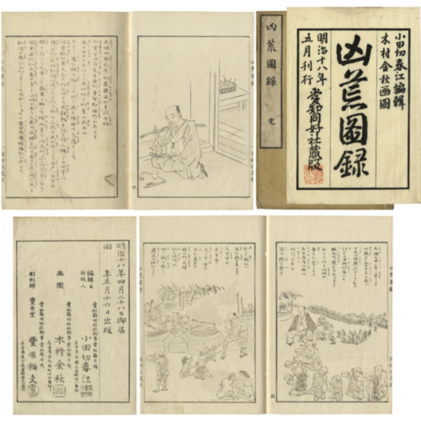 • 解説 33枚表二表三共 版心「凶荒圖録 同好社蔵版」 喉下に丁数 愛知同好社蔵版 原表紙 原題簽「凶荒図録 完」 元袋付 22.8×15.2糎 拵帙入 江戸時代の享保・天明・天保の大飢饉を絵入で説明している。