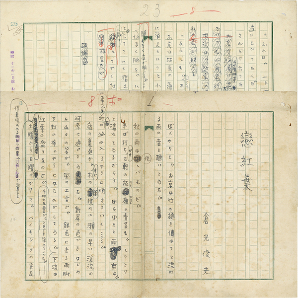 • 解説 『戀紅葉』 ペン400字詰完 欄外に「楽園十ノ十一月号わ印」 「ぼんやりと、お京は竹の樋を傳はって流れる雨の音を聴いてゐた。秋の雨は佗しいものだ。半ば朽ちかけた軒の板廂の青苔も、しっとりと濡れてゐるだらう。~」