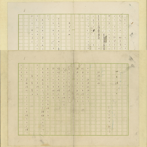 • 解説 『四五枚づゝ』 ペン400字詰完 末に「昭和二十一年七月」 帖仕立 拵帙入 「劇場」昭和21年7・8月合併号所載 小題「放課時間」「こじつけ」「日光」「人生」「ゆめ」「脚光」「あぢさゐ」 「放課時間 いま、放課時間です。蛙飛びをする子供たち、角カをどる子供たち、縄飛びをする子供たち、じゃんけんをする子供たち、喧嘩をする子供たち、歌をうたふ子供たち~」~「あぢさゐ 今年はあぢさいゐの色がわるい。どこへ行つても、あの、パッとした光に目を打たれない。あぢさいゐの色のわるい年は。・・・・・・さア、あとを、何んとつづけたいいたらう?(昭和二十一年七月)」