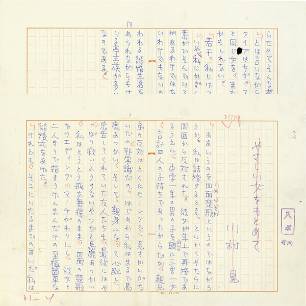 • 解説 『やさしい女をもとめて』 ボールペン400字詰完 「ああいうのを四面楚歌というのではなかろうか。私は結婚するとき、とにかくやたらに周囲から反対された。彼女が年上で再婚であるうえに、~」