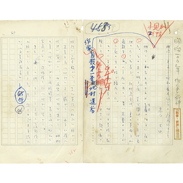 • 解説 『明治・大正・昭和有名作家の病気について』 ペン200字詰完 欄外に「「別冊・新評」編集部」印 「あかね書房原稿用紙」使用 「明治二十七年五月十五日は月の明るい夜だった。その月の明るい夜、芝公園地二十号四番地の小さな家で、北村透谷は、妻の美那子が寝静まってから外へ出て、青い若葉のひろがった庭の木の枝で縊死した。~」