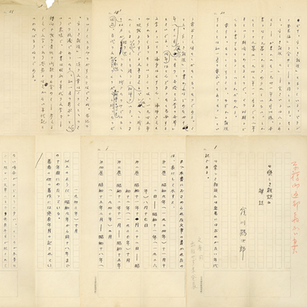 • 解説 『中野重治「樂しき雑談」解説』 ペン200字詰完 ノンブルは1~21、ダッシュが付いてほぼ2枚づつ有 欄外に鉛筆書で「文庫用のため出版せず 未発表」 「『楽しき雑談』は容易には求めがたい年代記である。まづ本書におさめられた文章の書かれたのは、表にして示すと、~」