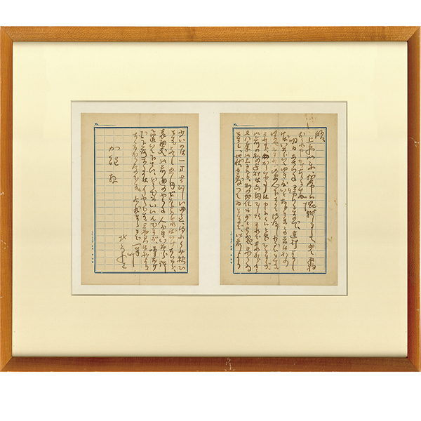 • 解説 加能作次郎宛 年次不明 ペン2枚18行 封筒欠 台紙貼付(台紙サイズ27×40糎) 額面37.5×45糎(縁少傷ミ・外箱なし) 「啓 上京以来、非常に混雑しまして、少々原稿おくれ申しわけありませぬ。明日あちらに帰りますので、選料よろしければいただいてゆきたいと存じます。この者は私の婆やですから御安心下さって御渡しねがひます。それから、かういふ事は申にくいと思ひますが、此前の私の選料は六円でした。~」