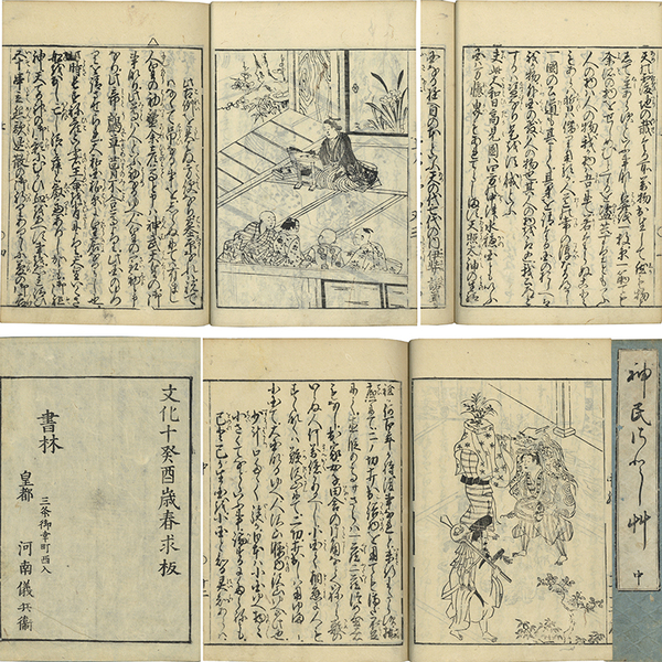 • 解説 上23枚2図・中22枚4図表三共・下28枚2図(刊行者一覧・刊記共) 刊記「文化十癸酉歳春求版 書林 皇都 三条御幸町西入 河南儀兵衛」 原表紙 原題簽「神民さとし草 中」(上巻半分欠・下巻欠) 22.3×15.8糎 拵帙入