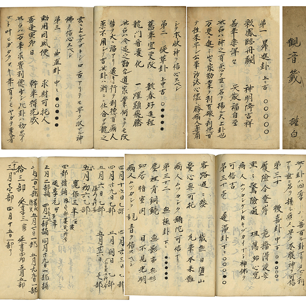 • 解説 一頁6~7行書 19枚 三十二卦 原表紙 表題「観音籖 謹白」 22.8×16.5糎 拵帙入 項目は次の通り <第一 昇進卦 上々吉 /第二 従革卦 上中吉 /第三 曲直卦 中々 /第四 閏下卦 上々吉  /第五 炎火卦 中々 /第六 稼穡卦 中々 /第七 漸寧卦 中上 /第八 得助卦 上々大吉 /第九 安木卦 中上吉 /第十 隨心卦 上々大吉/第十一 百達卦 上中大吉 /第十二 万安卦 上々吉 /第十三 難進卦 中下 /第十四 安靜卦 中下/第十五 阻隔卦 下々 /第十六 消厄卦 上々吉 /第十七 喜至卦 中々 /第十八 猶豫卦 下/第十九 豊稔卦 上々吉 /第二十 得禄卦 上々大吉 /第二十一 明昌卦 中上々吉 /第二十二 福禄卦 上々大吉/第二十三 凝滞卦 下々 /第二十四 榮顯卦 上中上大吉 /第二十五 相見卦 中々 /第二十六 永成卦 大上吉 /第二十七 歳稔卦 上々吉 /第二十八 交泰卦 上々吉 /第二十九 四季 上々吉 /第三十 後喜卦 中下 /第三十一 遅滞卦 下々 /第三十二 無極卦 下々>
