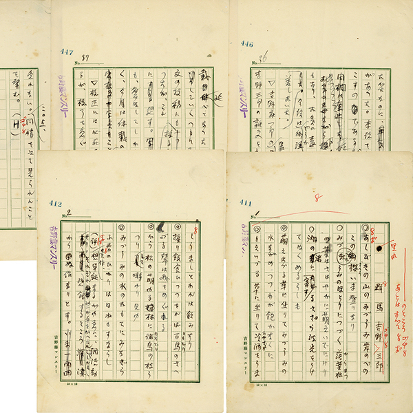 • 解説 《機関誌歌欄の選評原稿》 ペン160字詰完 無署名・巻末に「H」のサイン入 「吉野藤マンスリー」専用箋使用 欄外に「吉野藤マンスリー」印有 宣伝月刊誌「吉野藤マンスリー」編集時代(S8~16)
