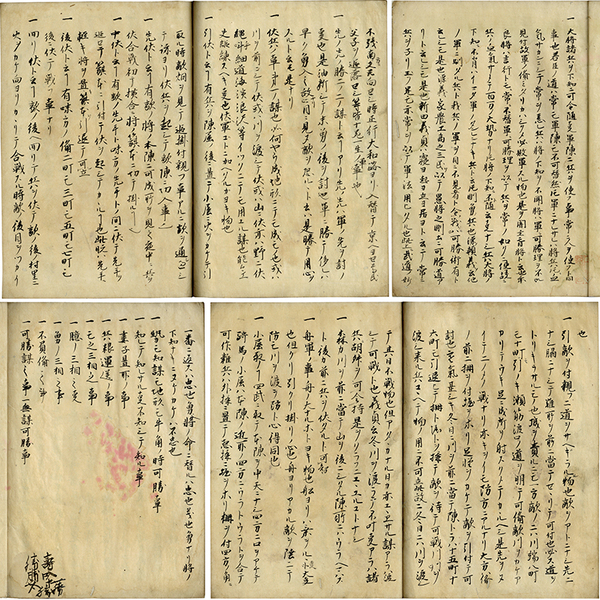 • 解説 一頁11行書 31枚 118ヶ条収録 原表紙 29.5×20.7糎 拵帙入 巻頭「一 大将諸兵ヲ下知ニ可令随事軍陣ニ兵ヲ使フ事・・・」に続き、「一 可勝謀之事一無謀可勝事」まで