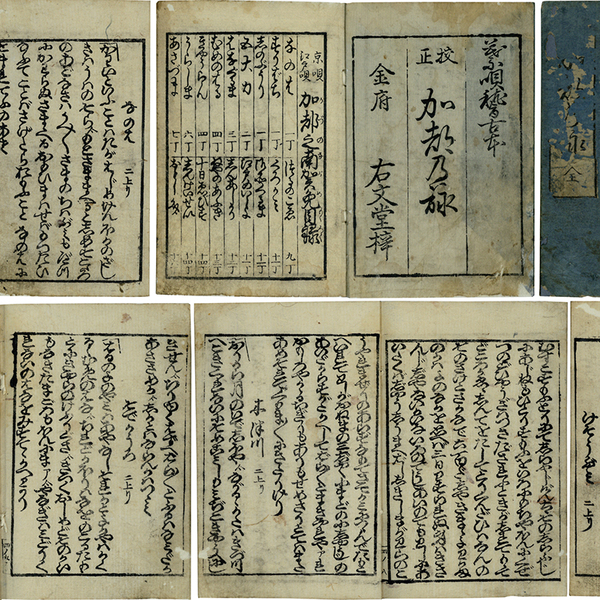 • 解説 右文堂梓 37枚 原表紙 原題簽(部分) 表2「葉唄稽古本 校正 加都乃詠 金府 右文堂梓」内題「京唄 江戸唄 加都之南賀免目録」 16.1×11.3糎 拵帙入