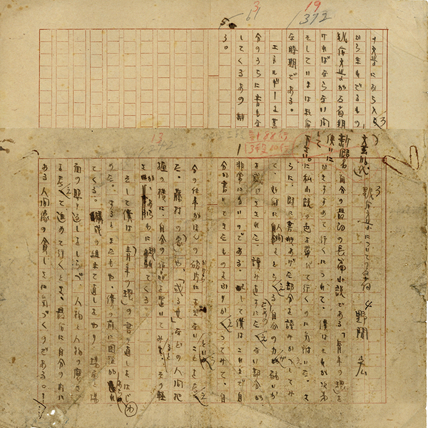 • 解説 『戦后文学についての反省』 ペン400字詰完 欄外に「(文芸時代)新假名使いにして下さい。」 1枚目汚れ有 「自分の最初の長篇小説である「青年の環」をかきすすめて行くにつれて、僕はそれが次第に私小説の色を帯びて行くのに気附いた。さらに、既に書きあげた部分を ~」