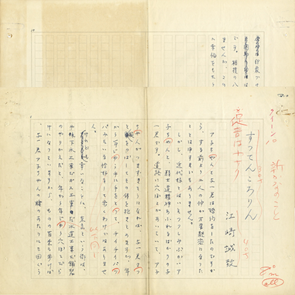 • 解説 『すってんころりん』 ペン400字詰完 「エサキ」専用箋使用 欄外に赤鉛筆で「クイーン」 「ア子ちゃんと与一君は婚約をしたのですから、する前より二人の仲が万来親密になったことは申すまでもありません。しかし、近代娘とはいえつつしみぶかいア子ちゃんと、騎士道精神あふれるばかりの与一君です。~」
