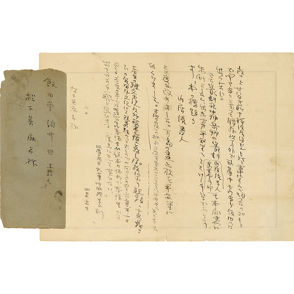 • 解説 松下英麻呂宛 昭和21年1月2日 ペン15行 封筒付 左手で書かれた珍しい書簡(文末に「左手乱筆御容赦」とあり) 「~ さて篆刻家中神岳郷の篆刻も本扉裏に朱刷としたく、出来次第平安堂へととける手筈であります。本の標題も山居読書人と三度は改めました。※島の畫二枚を平安堂におくりました。~」