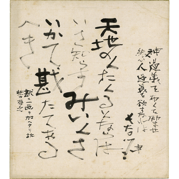 • 解説 『神道義を 布くを励ませ給ひ 人道義を欲すなれは 天地の人 おくるとならは いざ知らず みいくさいかて 戡たてあるべき 戡ニ一画ヲ加ヘタリ故 些カ有之 長谷川伸』 ヤケシミ・折れ有