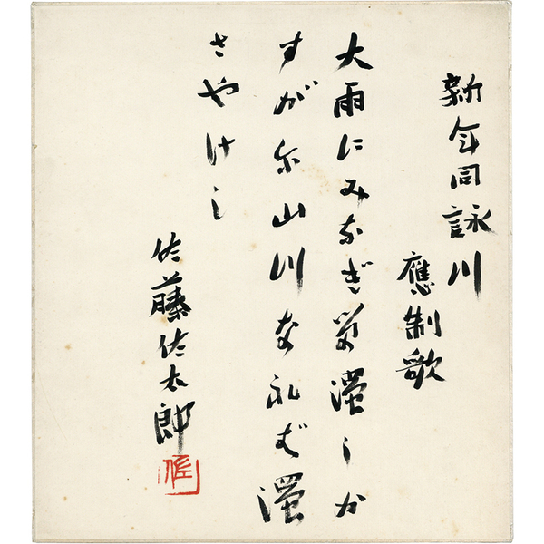 • 解説 『新年同詠川應制歌 大雨に みなぎる濁 しかすがに 山川なれば 濁さやけし 佐藤佐太郎[落款]』
