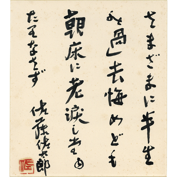 • 解説 『さまざまに 半生の過去 悔めども 朝床に 老涙した たりなさず 佐藤佐太郎[落款]』