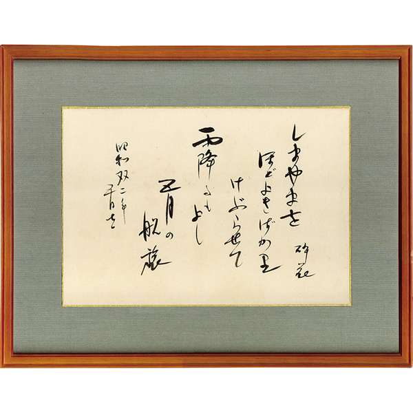 • 解説 『しまやまをほどよきばかりけぶらせて雨降るもよし五月の船旅 昭和双二年五月生 砕花』 紙面23.5×33糎 額面37×47糎