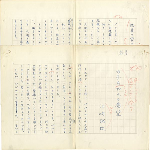 • 解説 『カ子ちゃんの希望』 ペン400字詰完 「エサキ」専用箋使用 9枚目「読者の皆さんへ」 欄外に「クイーン」印 「それから一カ月後に、パパとママは元気で洋行から帰ってきました。それを迎えたカ子チャンヤア子ちゃん与一君の若夫婦もみな元気でした。一家は、もとのままのしあわせな生活にもどりました。~」